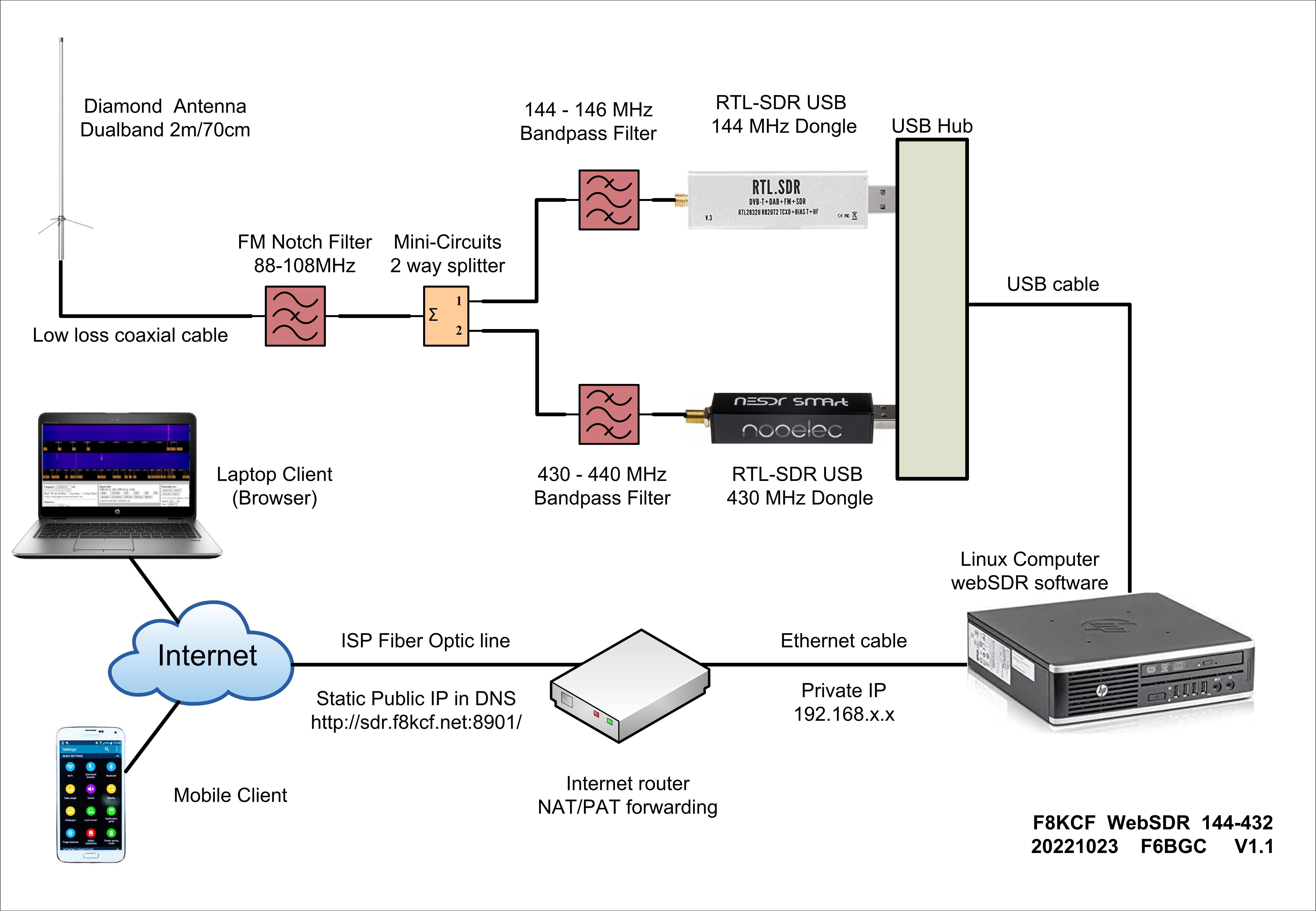 Le WebSDR 144-438 a été mis en place dans notre radio club en 2016, il est maintenant connecté à une ligne Internet fibre.