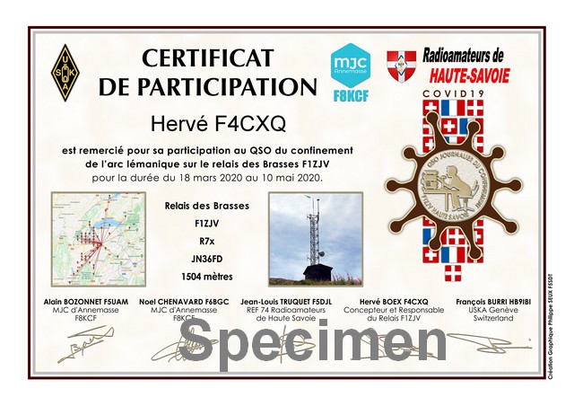 Nous avons décidé d’éditer un Certificat de participation individualisé qui sera envoyé à tous les radioamateurs ayant rejoint le QSO au moins une fois, ainsi qu’à tous ceux qui nous ont écouté à l’aide d’un récepteur VHF ou sur les webSDR.