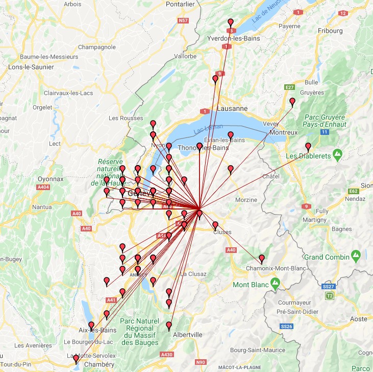 La carte visualise les carrés Locator de ce QSO historique : l’Ain, la Savoie et la Haute Savoie étaient représentés ainsi que les cantons suisses de : Genève, Vaud, et Fribourg .